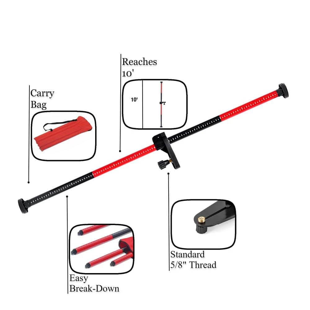 Add this 10 ft. Extendable Mounting Pole to your toolkit. An included, sturdy plastic mounting plate with a 5/8 in. INC thread holds the unit in place. The heavy-duty extendable mounting pole allows you to maintain a safe hold over your laser unit. With the self-clamping feature, you can adjust the pole from floor to ceiling securely. Connect and lock this pole in two 2 ft. sections for your desired height. A color change at 12 in. intervals offers versatility.