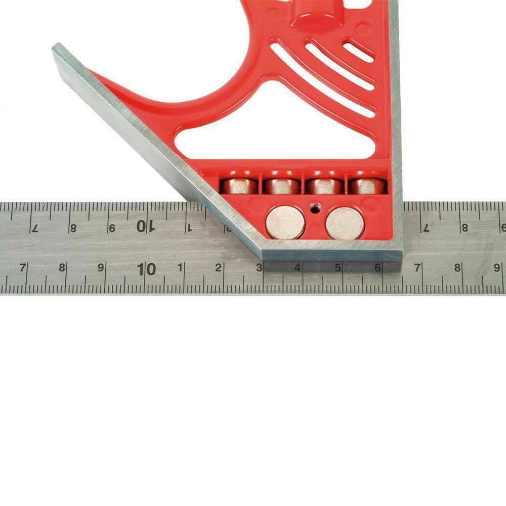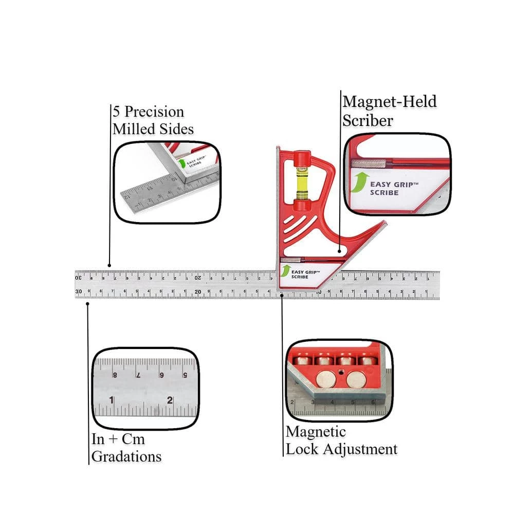 The Magnetic Combination Square includes a magnetic lock adjustment stainless steel, permanently etched ruler markings in inches and centimeters. Provides 5 milled sides for superior accuracy. Includes easy grip magnet-held stainless steel scribe and belt holster.