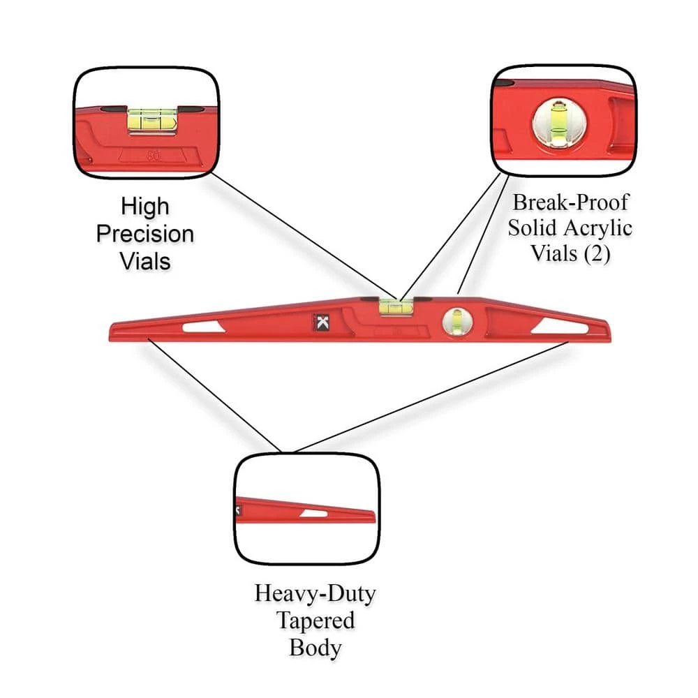 Mason’s level must be tough – hammered and dropped, the level has to maintain its accuracy in the toughest working conditions. The Kapro 720 Supercast. Masonry Level is a modern-shaped heavy duty mason’s level, innovatively designed with a heavy duty cast trapezoid profile. The 720 can take hit after hit and always keeps its accuracy and integrity. A finely milled base insures the 720 improves the accuracy of leveling especially when doing tile work by keeping the level directly against the measuring surface. The 720 features 2 breakproof solid acrylic vials with an unpresented accuracy of 0.0005 inch per inch. Vial accuracy guaranteed for life.