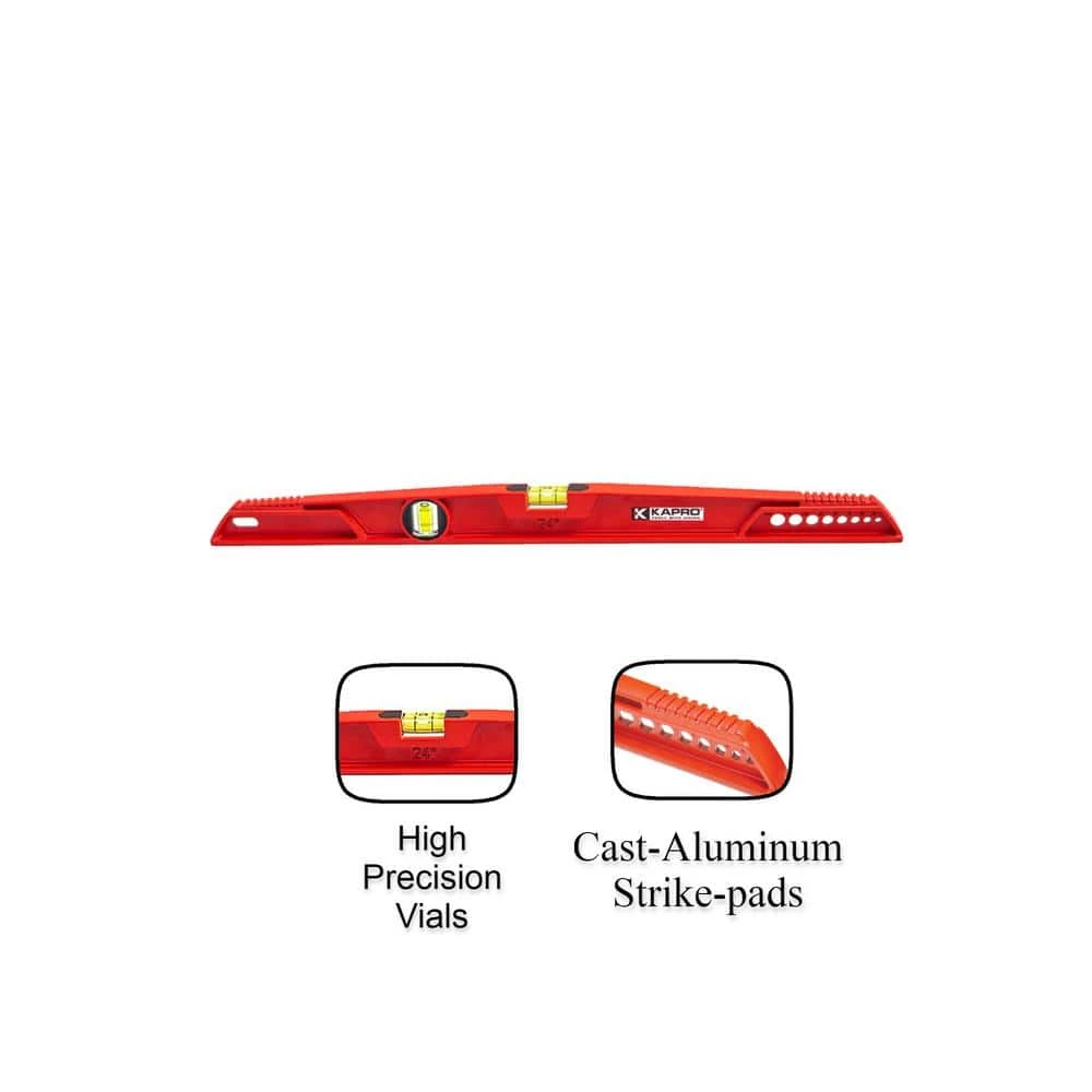 The Kapro 730 Topcast level is designed with horizontal and vertical vials, a heavy-duty tapered body, strike pads, and a drill bit diameter gauge to withstand the rigors of masonry and tiling work. The two vials are hand calibrated to less than 0.0005 in per in. A drill bit diameter gauge has been designed into the head of the level, and this model comes in several different lengths to match any job. Molded within the heavy-duty cast aluminum body are 2 anvil strike pads designed for the blows of your trowel or mallet to help level your blocks and tiles. This level is sprayed with an electrostatic powder and then baked with a durable epoxy polyester paint to resist the harsh mortars used in the wet cement trades. This mason level is applicable for tiling, masonry, and construction projects. At Kapro, we reimagine precision tools and accessories for professional craftsmen to weekend warriors while setting high standards by driving innovation in our designs.