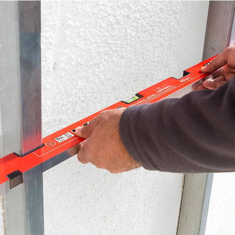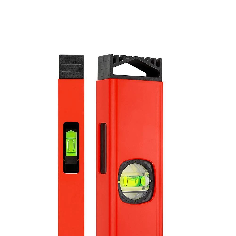 - Aluminum box level profile with stud slots and markers at 16 in. and 24 in. for standard stud layout