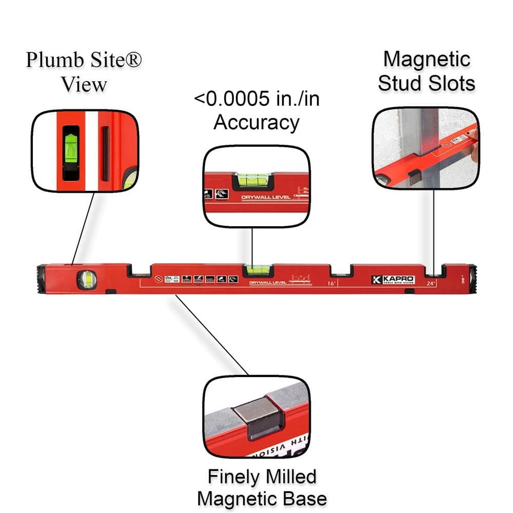 The 773 is Kapro latest innovation in tools, making stud layout easier than ever before. Until now stud layout required 3 hands 2 for the tape measure and 1 for the stud or pencil. The 773 Stud Layout Level is designed with magnetic stud slots. The 773 is designed to allow you to insert the stud into the slot and the 773s strong rare-earth magnets hold it tight while you set them in place. The slots are positioned at the standard positions of 16 in. and 24 in. with clear layout markers printed on the levels side. In addition to horizontal alignment the 773 includes Kapro patented Plumb-Site Dual View feature that gives you the clearest and most accurate view of the vial when doing vertical layout. The 773 has all the top quality features that you expect in Kapro levels, including, 2 Epoxy locked, solid acrylic vials, 1 Plumb Site Dual-View vertical vial, and 1 horizontal vial, Accuracy of 0.0005 in./inch and a finely milled surface.