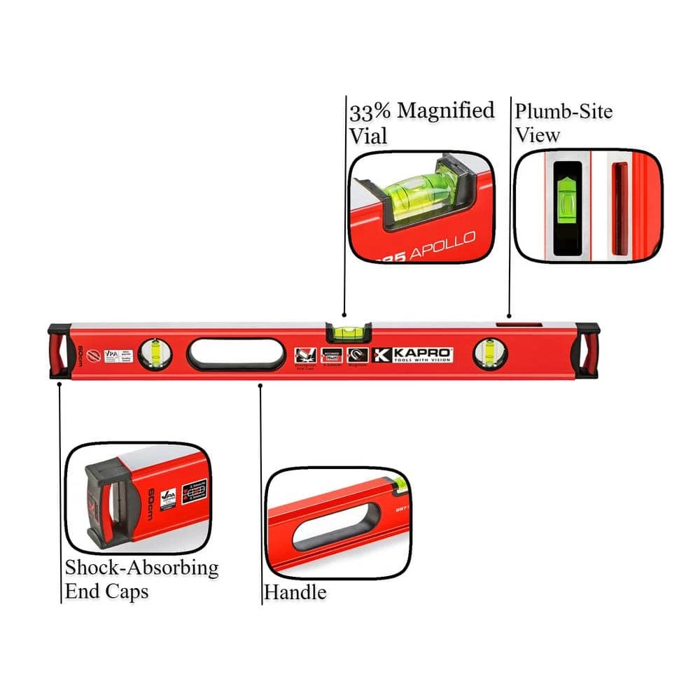 The professional-grade Kapro 985-41X Apollo Box Level features VPA certified, hand-calibrated vials to help you level and measure with ease. This box level has 3 magnified shockproof acrylic vials that are 33% more visible than traditional vials. Our vials have a sensitivity of 0.0005 in./in. (0.5 mm/m) and are machined from an optical-grade acrylic block to provide clear readings and resist breakage.The Kapro 985 Apollo is fully reversible for quick transitions between floor and ceiling leveling and allows for plumb measuring without parallax errors. These professional levels are used in carpentry, construction, masonry, and tiling. The reinforced asymmetric aluminum frame, ergo-grip handles, and shock-resistant end caps make it easy to handle for extended periods.At Kapro, we reimagine precision tools and accessories for professional craftsmen to weekend warriors while setting high standards by driving innovation in our designs.