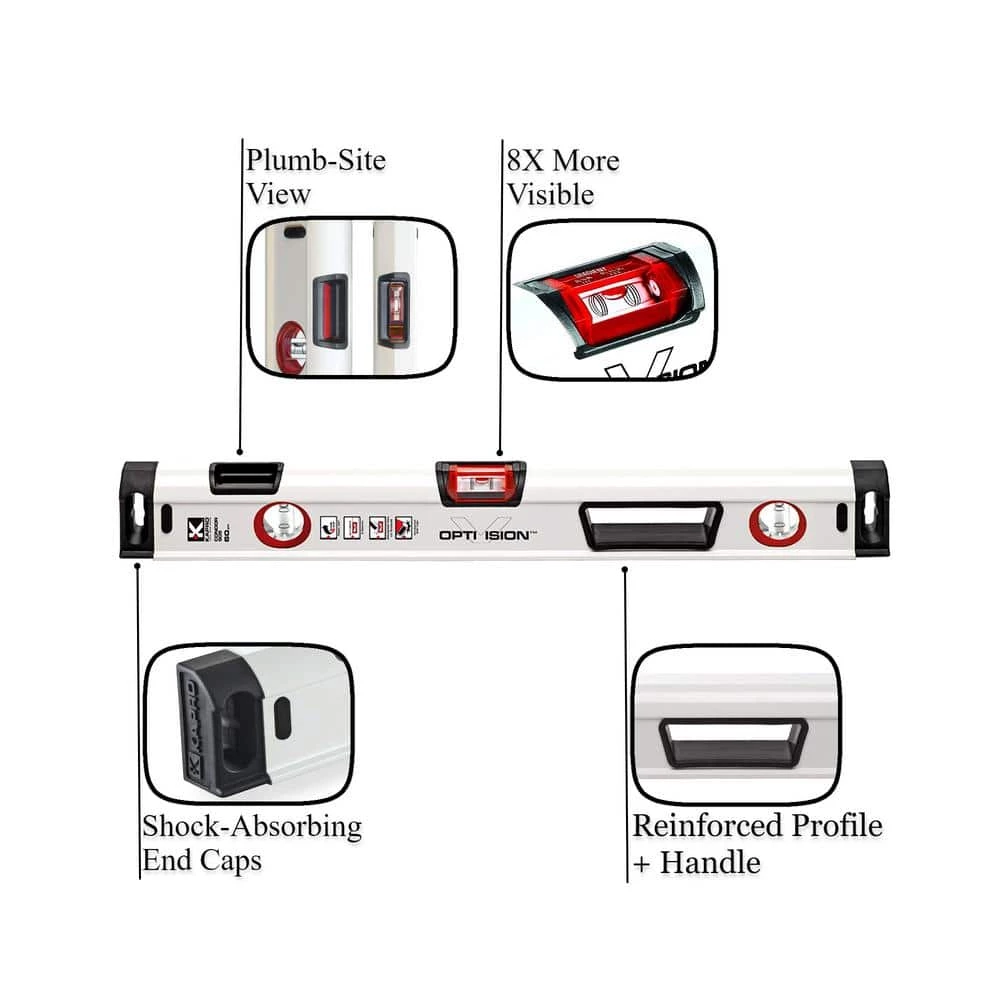 - OPTIVISION red horizontal vial creates highly visible red bubble edges, for exact placement between the reading lines and optimal vision in low light