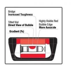 - 3 solid acrylic shockproof vials: – 1 optivision red horizontal vial creates highly visible red bubble edges 1 plumb site dual-view vial with red effect – 2 Plumb solid acrylic vertical vials with 1 plumb site dual-view vial