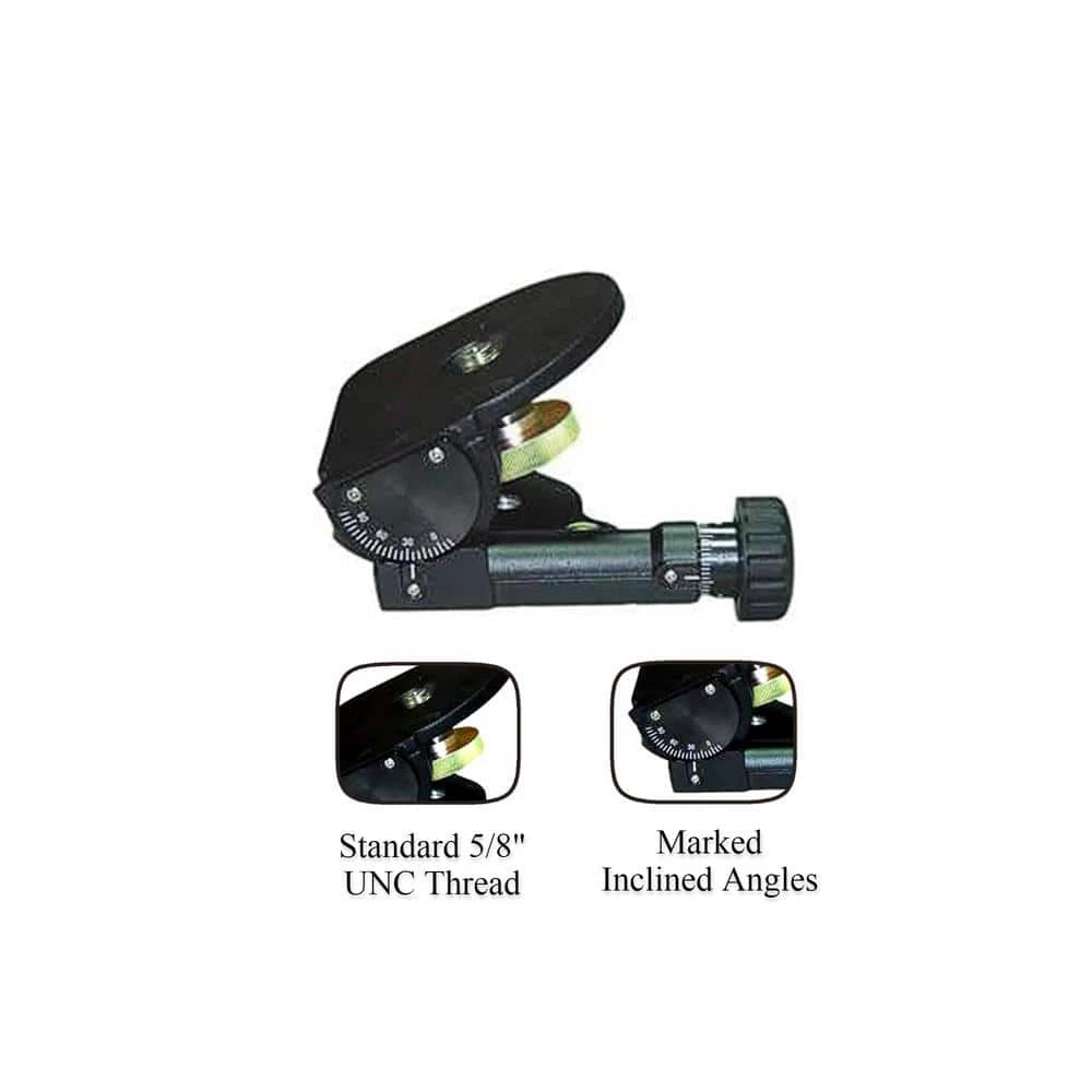 The laser angle mount will allow you finely tune precise accurate indication of inclined angle. The angle attachment fits the standard tripod 5/8 in. UNC (16 mm) thread mound. The angle mount has a precise adjustment mechanism with a scale in degrees and includes a surface level vial to check level easily.