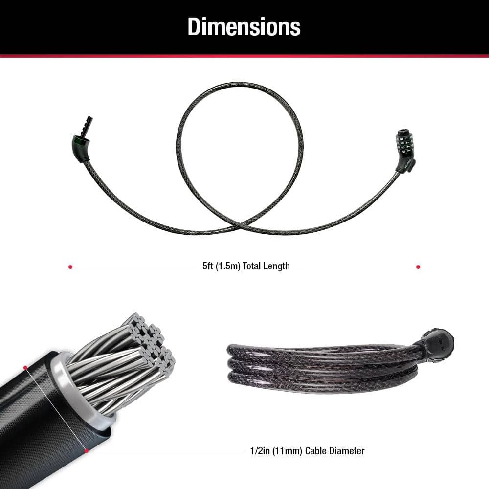 The Master Lock 8370DCC Bike Lock Cable with Combination, Resettable is 5 ft. (1.5 m.) long and features 1/2 in. (12 mm.) diameter braided steel for maximum strength and flexibility. Bike lock cable offers a protective vinyl coating which protects against scratches. Bike lock includes a four-dial combination lock which provides security and key-less convenience. Master Lock’s Lifetime Guarantee provides peace of mind from a brand you can trust.