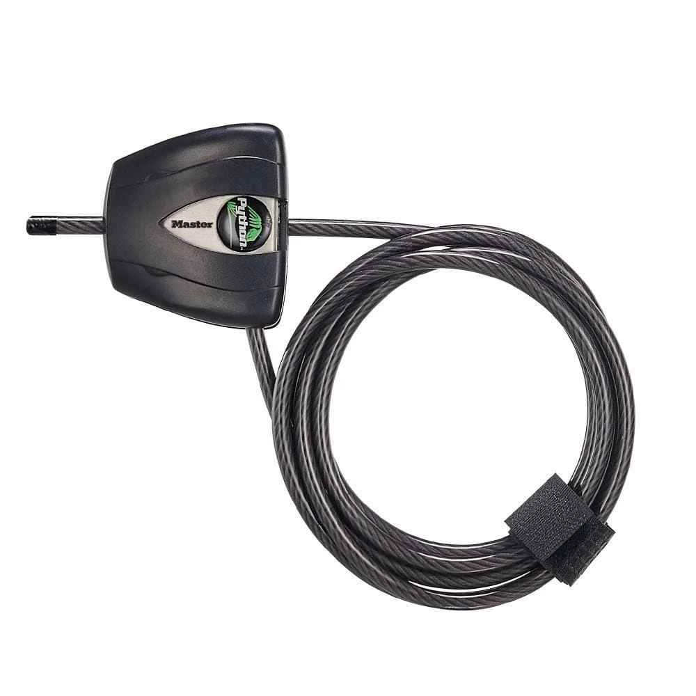 The Master Lock 8417D Cable Lock with Key, Adjustable to 6 ft. (1.8 m.) Long features 3/16 in. (5 mm.) diameter braided steel for maximum strength and flexibility. Python cable lock with key includes a protective vinyl coating which helps defend against scratches. Cable lock’s integrated pin tumbler keyed locking mechanism provides superior pick resistance. Cable and lock are both rust-resistant, providing superior weather resistance. Master Lock’s Lifetime Guarantee provides peace of mind from a brand you can trust.
