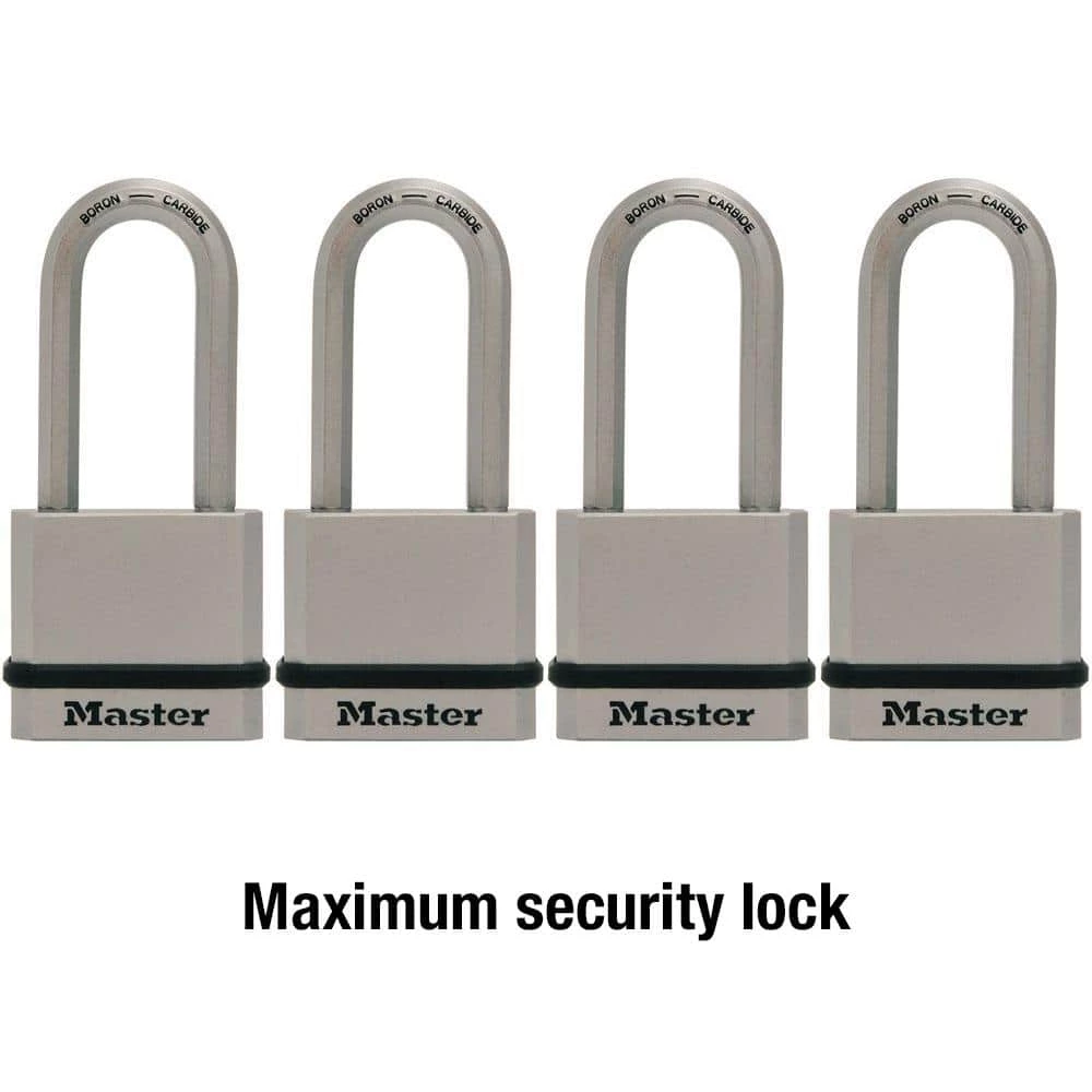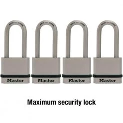 The Master Lock M530XQLH Heavy Duty Outdoor Padlock with Key, Four Pack, features a 1-3/4 in. (44 mm.) wide solid steel body for maximum strength and reliability. Octagonal lock shackle is 2 in. (51 mm.) long and made of tough-cut boron-carbide, 50% harder than hardened steel, offering maximum resistance from cutting and sawing. Lock five-pin cylinder prevents picking and the dual locking ball bearings provide maximum resistance against prying and hammering. Padlock covered keyway offers maximum weather protection, and reinforced body bumper protects against scratches. Master Lock’s Lifetime Guarantee provides peace of mind from a brand you can trust.