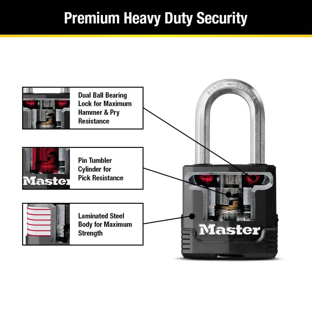 - Four-pin cylinder and dual ball bearing locking mechanism provides maximum pick and pry resistance; Tough-Cut octagonal boron-carbide shackle is 50% harder than hardened steel