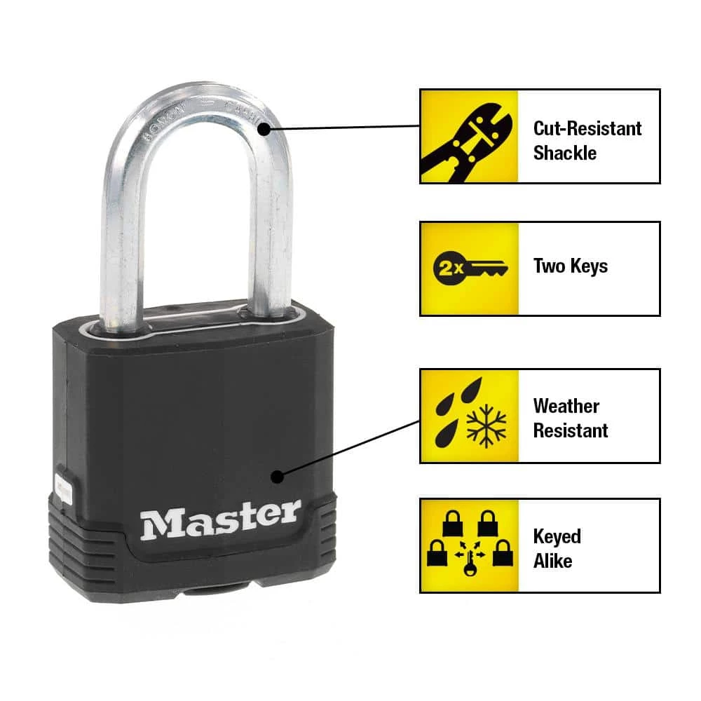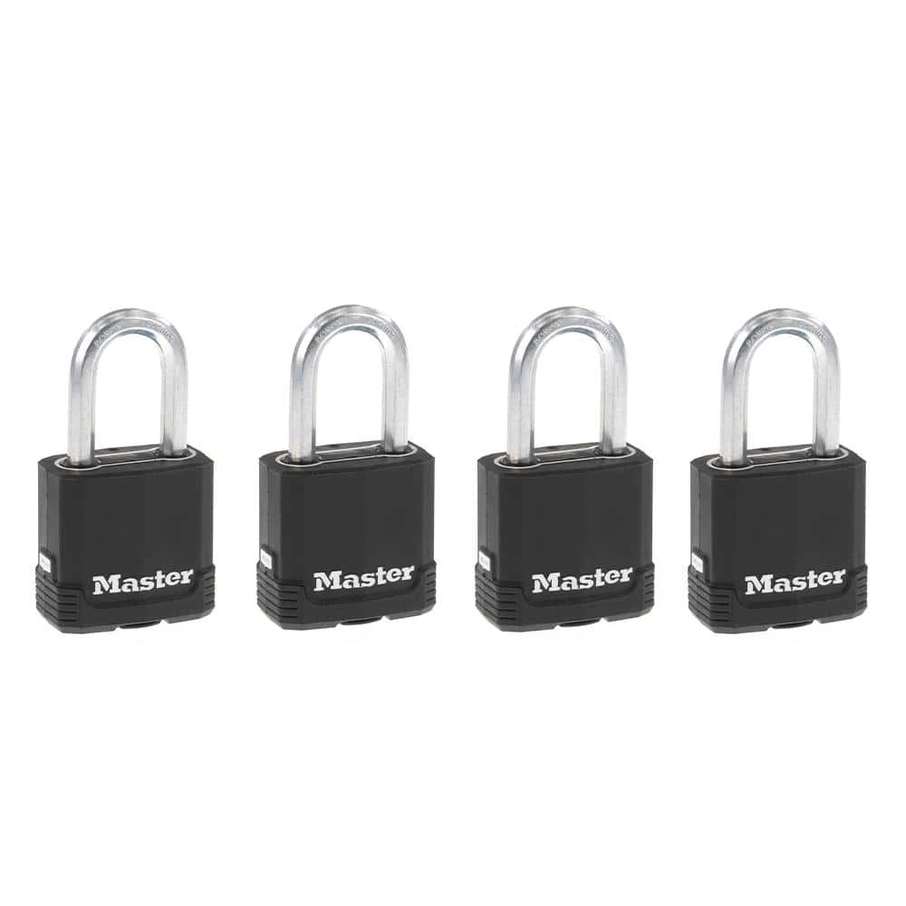 The Master Lock M115XQLFCCSEN Heavy Duty Outdoor Padlock with Key, Four Pack features a 1-7/8 in. (48 mm.) wide laminated steel body for maximum strength and reliability, and is surrounded by stainless steel and zinc outer components for weather resistance. Key lock features Rust-Oleum Certified protection provides a lifetime guarantee against rusting on the lock body; and covered lock body, keyway, and shackle seals offer additional weather protection. Octagonal lock shackle is 5/16 in. (8 mm.) wide in diameter and is 1-1/2 in. (38 mm.) long and made of Tough-Cut boron-carbide, 50% harder than hardened steel, offering maximum resistance from cutting and sawing. Lock four-pin cylinder prevents picking and the dual locking ball bearings provide maximum resistance against prying and hammering. Master Lock’s Lifetime Guarantee provides peace of mind from a brand you can trust. Rust-Oleum Certified Protection is a registered trademark of Rust-Oleum Corporation.