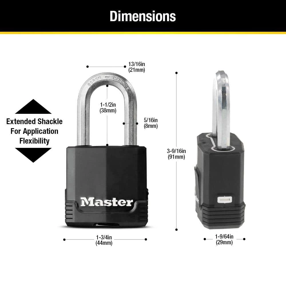 - Measurements: 1-7/8 in. (48 mm.) wide lock body; 5/16 in. (8 mm.) diameter shackle with 1-1/2 in. (38 mm.) length, 13/16 in. (21 mm.) width; Extended shackle for application flexibility