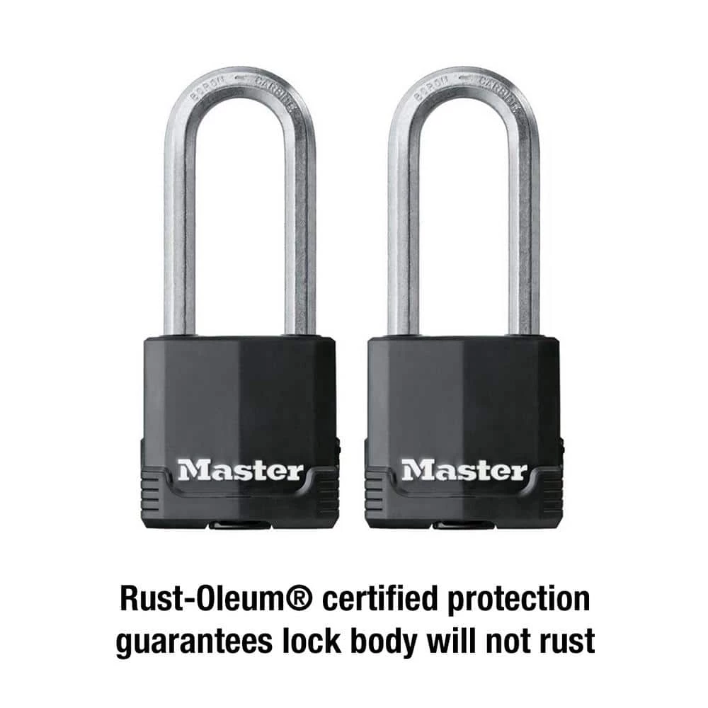 The Master Lock M515XTLJHCSEC Heavy Duty Outdoor Padlock with Key, Two Pack features a 2-1/8 in. (54 mm.) wide laminated steel body for maximum strength and reliability, and is surrounded by stainless steel and zinc outer components for weather resistance. Key lock includes Rust-Oleum Certified protection which provides a lifetime guarantee against rusting on the lock body, and covered lock body, keyway, and shackle seals offer additional weather protection. Octagonal lock shackle is 3/8 in. (10 mm.) wide in diameter and is 2-1/2 in. (64 mm.) long and made of Tough-Cut boron-carbide, 50% harder than hardened steel, offering maximum resistance from cutting and sawing. Lock four-pin cylinder prevents picking and the dual locking ball bearings provide maximum resistance against prying and hammering. Master Lock’s Lifetime Guarantee provides peace of mind from a brand you can trust.