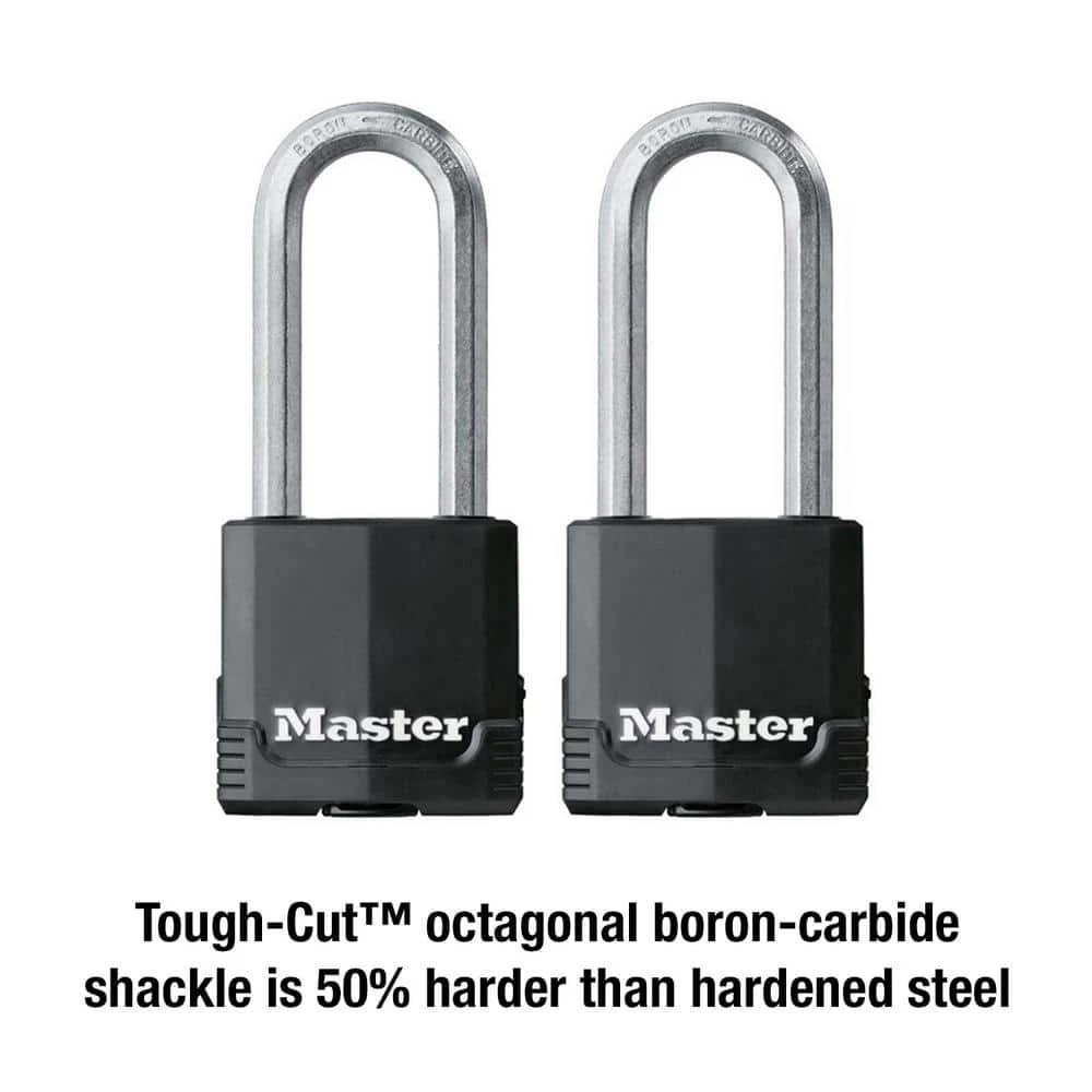 - Four-pin cylinder and dual ball bearing locking mechanism provides maximum pick and pry resistance; Tough-Cut octagonal boron-carbide shackle is 50% harder than hardened steel