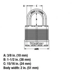 - Measurements: 2 in. (51 mm.) wide lock body; 3/8 in. (10 mm.) diameter shackle with 1-1/2 in. (38 mm.) length, 15/16 in. (24 mm.) width; Extended shackle for application flexibility