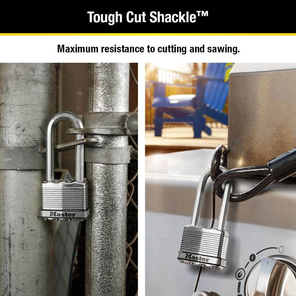 The Master Lock M5XTLJCCSEN Heavy Duty Outdoor Padlock with Key, Two Pack features a 2 in. (51 mm.) wide laminated steel body for maximum strength and reliability, and is surrounded by stainless steel and zinc outer components for weather resistance. Octagonal lock shackle is 3/8 in. (10 mm.) wide in diameter and is 2-1/2 in. (64 mm.) long and made of Tough-Cut boron-carbide, 50% harder than hardened steel, offering maximum resistance from cutting and sawing. Lock four-pin cylinder prevents picking and the dual locking ball bearings provide maximum resistance against prying and hammering. Master Lock’s Lifetime Guarantee provides peace of mind from a brand you can trust.