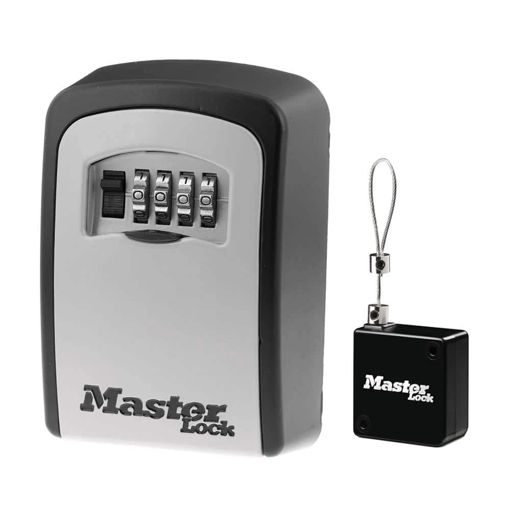 The Master Lock 5401THRDHC features both 5401D Lock Box, Resettable Combination Dials and 5490D Retractable Lock Box Key Tether. Large capacity key lock box enables secure storage of up to five keys. Retractable cable allows enough flexibility to access the door from a variety of portable and wall mount lock box locations. Lock box features a set-your-own four digit combination; Reset the combination for thousands of personalized combination code options. Wall-mount lock box and retractable key tether are for indoor and outdoor use. Key safe is constructed with a metal body for durability and key tether is a solid steel cable. Master Lock’s Lifetime Guarantee on the 5401D (Two-Year Warranty on 5490D) provides peace of mind from a brand you know and can trust.