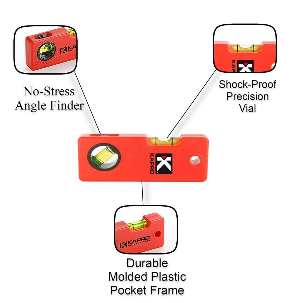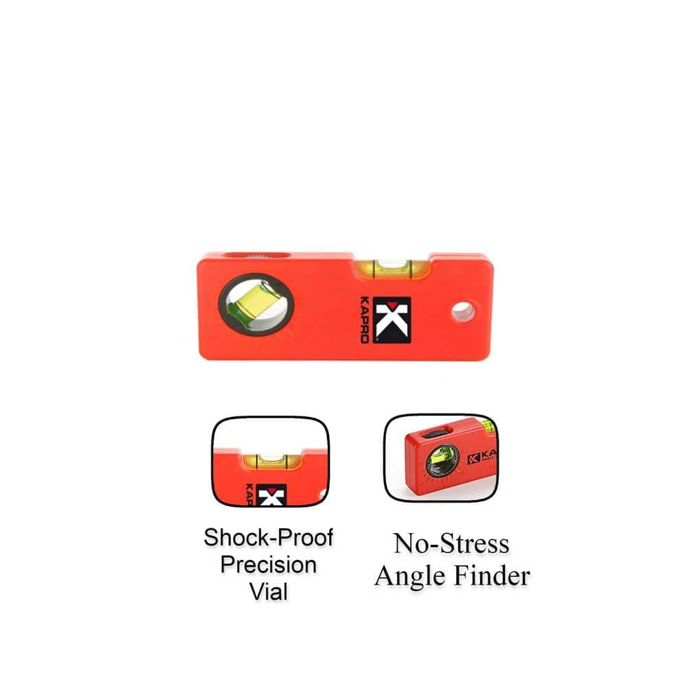 Measuring at 4″, the Kapro 245 Mini Level conveniently fits in your pocket or tool belt. This level features an easy-to-read horizontal vial and angle finder with a Top-scroll Adjustment.The Kapro 245 Mini Level is perfect for Weekend Warriors and DIYers! Small and compact, this level can be used in plumbing and carpentry projects and landscaping. Encapsulated in a strong molded plastic casing, the vials are UV resistant to help ensure superior longevity and easy reading.At Kapro, we reimagine precision tools and accessories for professional craftsmen to weekend warriors while setting high standards by driving innovation in our designs.