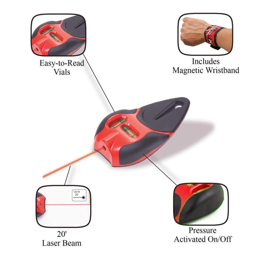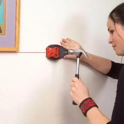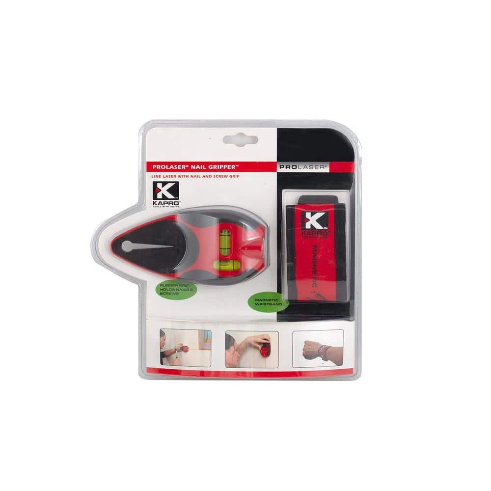 The 810 Prolaser Nail Gripper is a handy and easy to use home improvement tool that lets you line up shelves, pictures, cabinets, tiles, wall coverings, mirrors and more and safely hammer in nails. The 810 Prolaser Nail Gripper has a pressure activated on and off switch which projects a highly visible laser line when set against a flat surface. The laser has a range of up to 20 feet so you can line up your fixtures in relation to any point in the room. 2 integrated level vials let you clearly align the laser horizontally or vertically. The 810 is designed with a patented rubber grip which firmly grasps any size nail or screw for safe and easy nailing. The 810 comes with a magnetic wristband that gives you quick and easy access to nails or screws once the laser is in position. Kapro’s patented 810 Prolaser Nail Gripper keeps your hands safe and your room layout straight.