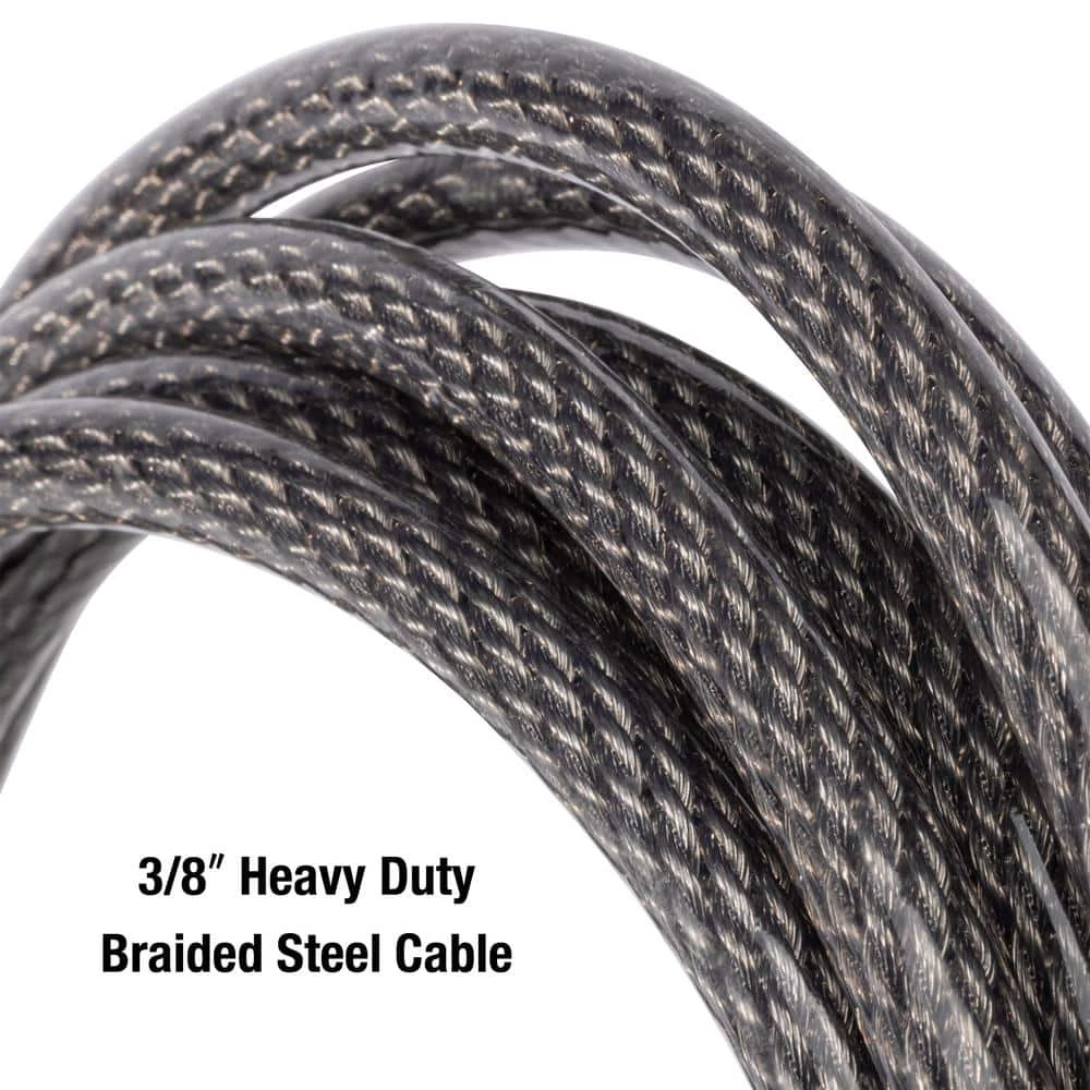 The Master Lock 72D Steel Cable with Looped Ends is 15 ft. (4.6 m.) long and features 3/8 in. (10 mm.) diameter braided steel for maximum strength and flexibility. Steel cable includes a protective vinyl coating protects against scratches. Looped end cable is self-coiling for easy storage. Steel cable is recommended to be used with laminated locks, solid steel locks and mini-U-locks, to secure large or bulky items (locks are sold separately). Master Lock’s Lifetime Guarantee provides peace of mind from a brand you can trust.